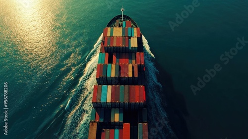 Aerial top view from a drone of cargo containers on a ship navigating the open sea, representing international import/export logistics in the Asia-Pacific region.