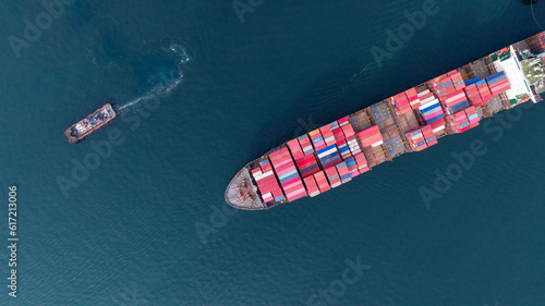 Aerial top view of cargo ship carrying container and running with tug boat for import export goods from cargo yard port to custom ocean concept freight shipping by ship .