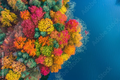 Aerial top view of countryside in autumn fall forest and blue lake. Neural network ai generated art