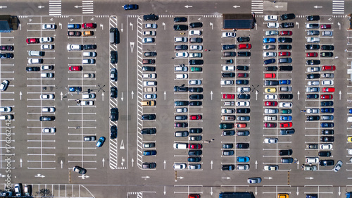 Aerial top view of parking lot with many cars from above, transportation and urban concept