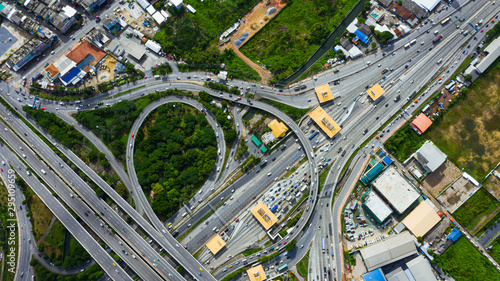 Aerial top view of Toll expressway and motorway payment point, Road traffic an important infrastructure in bangkok Thailand
