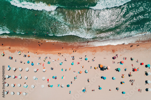 Aerial top view on the beach. Umbrellas, sand and sea waves