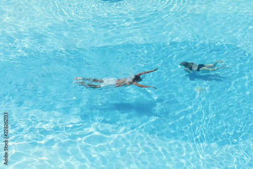 Aerial top view on the men and woman in the swimming pool with transparent blue water. in motion
