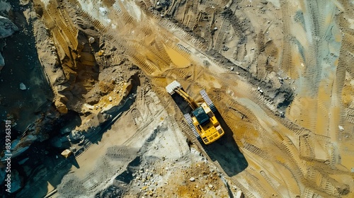 Aerial top view yellow industrial excavator working on sand quarry Concept Open pit mine industry : Generative AI