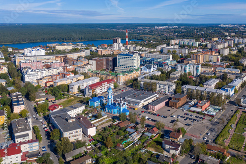 Aerial vew of Kaluga town and Uspenskaya church on summer sunny day. Kaluga Oblast, Russia.