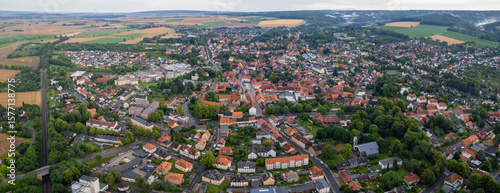 Aerial view around the old town in the city Königslutter am Elm, on an cloudy spring noon