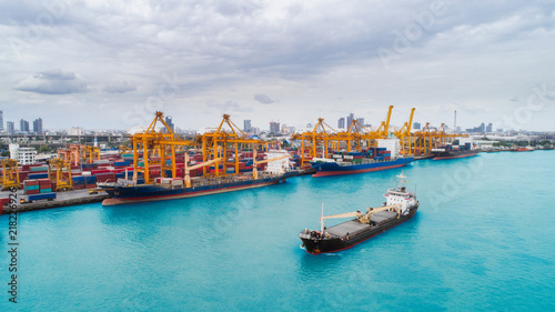 Aerial view container ship from sea port for import export or transportation concept background.