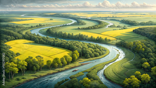 Aerial view, meandering river, lush green landscape, forest edges, vibrant yellow fields, curving waterway, serpentine pattern, natural beauty, bird's eye perspective, verdant meadows, spring colors,