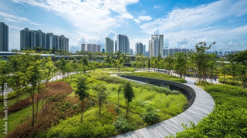 Aerial view of a beautifully landscaped urban park featuring lush greenery, walking paths, and modern city architecture in the background.