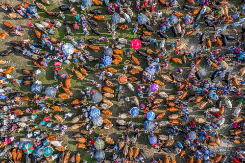 Aerial view of a bustling market with colorful umbrellas and livestock creating a vibrant tapestry of commerce and life, Mahasthan, Rajshahi Division, Bangladesh.