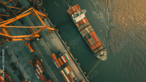 Aerial view of a cargo ship docked at a busy port with multicolored shipping containers and orange cranes, showcasing maritime trade.