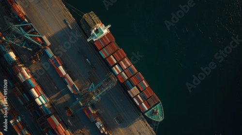 Aerial view of a cargo ship docked at a port.