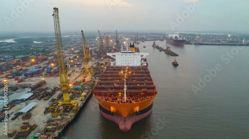 Aerial view of a cargo ship docked at a port, lit by cranes at dusk.