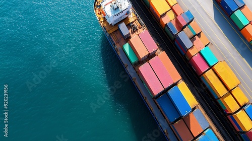 Aerial view of a cargo ship loaded with colorful containers, docked at a tranquil harbor surrounded by water.