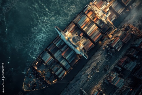 Aerial view of a cargo ship surrounded by colorful containers at a busy port during twilight.