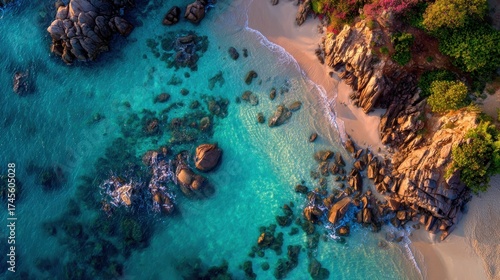 Aerial view of a coastal shoreline with clear turquoise water and rocks