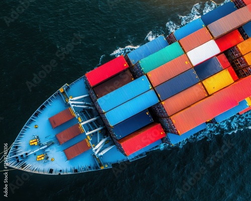 Aerial View of a Colorful Cargo Ship Carrying Containers Sailing in the Ocean