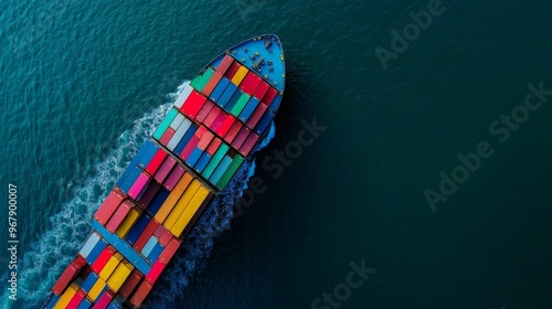 Aerial view of a colorful cargo ship transporting containers over the sea, showcasing global trade and maritime logistics.