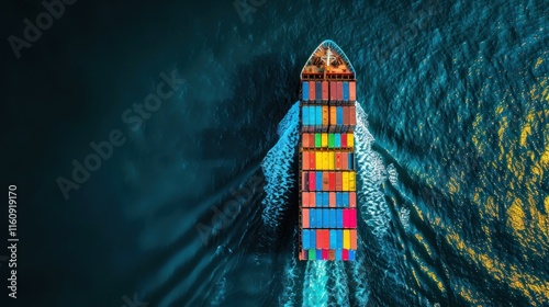 Aerial view of a colorful container ship moving through dark blue ocean.