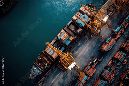 Aerial view of a container ship being loaded with cargo at a busy port, showcasing global trade and logistics