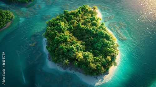 Aerial View of a Deserted Island with Emerald Forests and Shimmering Sandy Beaches, a Serene and Solitary Retreat
