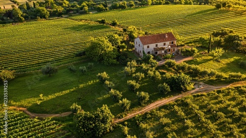 Aerial View of a Farmhouse nestled amidst Vineyards during Golden Hour