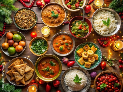 Aerial View of a Festive Indian Christmas Lunch Table with Traditional Dishes and Decorative Elements