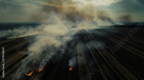 Aerial view of a field experiencing wildfire smoke and flames amidst agricultural rows.