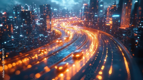 aerial view of a futuristic cityscape with glowing autonomous vehicles traversing smart roads holographic traffic management systems and sleek skyscrapers