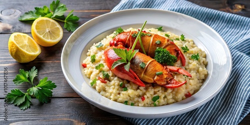 Aerial view of a gourmet seafood risotto with lobster tail garnished with parsley and lemon zest