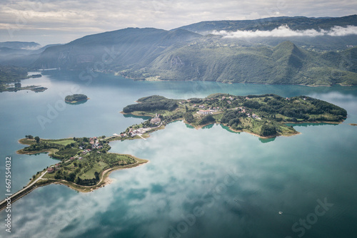 Aerial view of a island of Ramsko Jezero (Rama lake) in Prozor-Rama, Bosnia and Herzegovina.