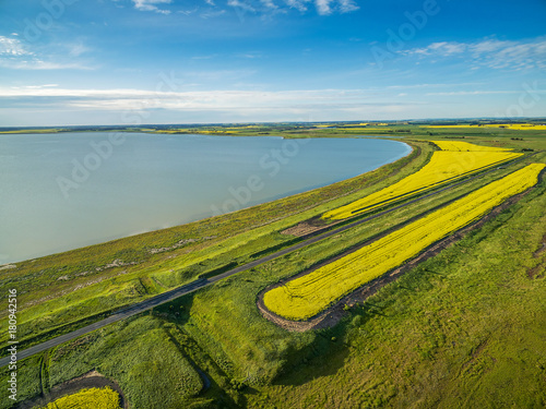 Aerial view of a lake and vivid yellow canola fields in Australia