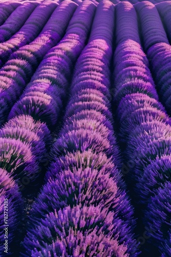 Aerial view of a lavender field in full bloom, rows of vibrant purple stretching across the landscape