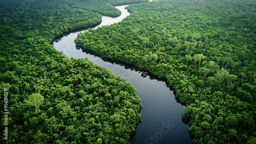 Aerial View of a Lush Green Forest with a Serpentine River Flowing Through