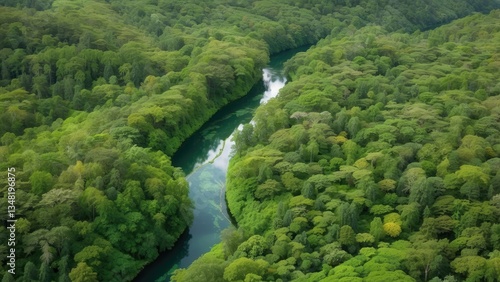 Aerial view of a lush green forest with a winding river cutting through it.