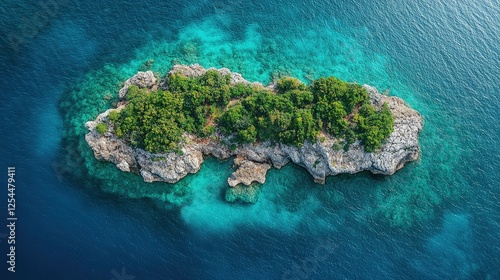 Aerial view of a lush green island surrounded by clear turquoise waters, showcasing natural beauty