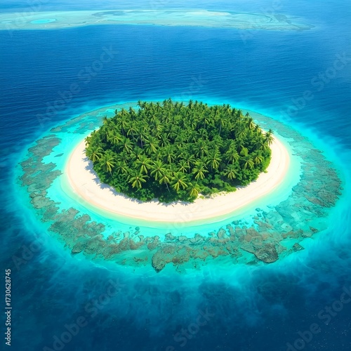 Aerial view of a lush green tropical island paradise surrounded by crystal clear turquoise ocean waters