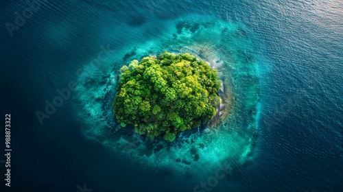 Aerial View of a Lush Green Tropical Island Surrounded by Clear Blue Ocean Waters