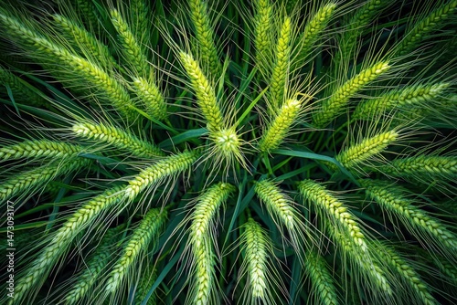Aerial view of a lush green wheat field. Bright sunlight highlights the vibrant green hues of the crops.