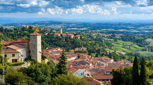 Aerial view of a majestic ancient walled city nestled amongst the rolling green hills of the Tuscan countryside with its historic architecture fortified walls and scenic panoramic landscape