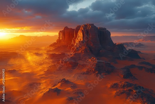 aerial view of a majestic desert landscape at sunrise featuring vibrant colors and towering rock formations amidst swirling sandstorms creating a mystical atmosphere