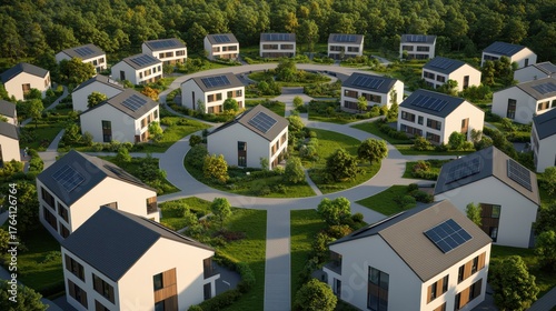 Aerial view of a modern, eco-friendly housing development featuring circular pathways and solar panels amidst lush greenery.