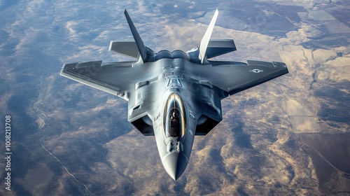 Aerial view of a modern military fighter jet in flight over a landscape.
