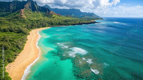 "Aerial View of a Pristine Tropical Beach with Turquoise Waters and Lush Greenery"