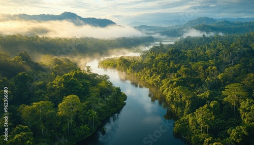 Aerial View of a River Winding Through a Misty Rainforest