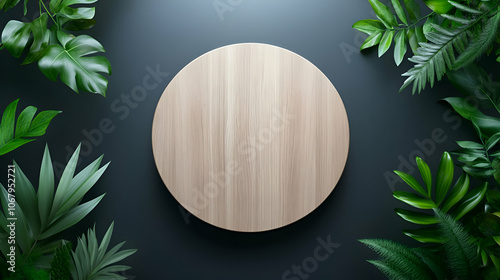 Aerial view of a round wooden table surrounded by plants in a dark office space