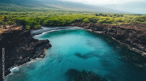 Aerial view of a secluded cove with turquoise water, dark volcanic rock formations, and lush green vegetation.