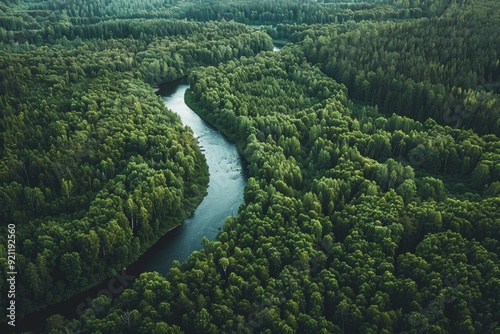 Aerial View of a Serene Forest Landscape with a Winding River and Lush Greenery