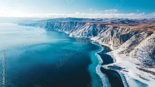 Aerial view of a serene, icy coastline with snow-covered cliffs and calm waters.