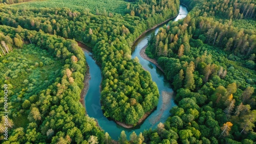 Aerial View of a Serpentine River Winding Through Lush Green Forest